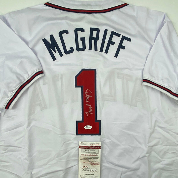 Autographed/Signed Fred McGriff Atlanta White Baseball Jersey JSA COA Auto This is a custom jersey and was not manufactured by or in any manner associated with any professional sports league or manufacturer. This custom jersey carries no professional sports league designation. The item is intended to be an autographed collectible. Reference of team in the title is to allow the purchaser a point of association. The custom jersey displays the name, number and authenticated signature of the player. This item in no way is affiliated with or connected to any professional sports organization. The autograph, as always is guaranteed to be authentic and has been certified as authentic by a third-party, trusted authenticator. Size is XL unless otherwise noted.