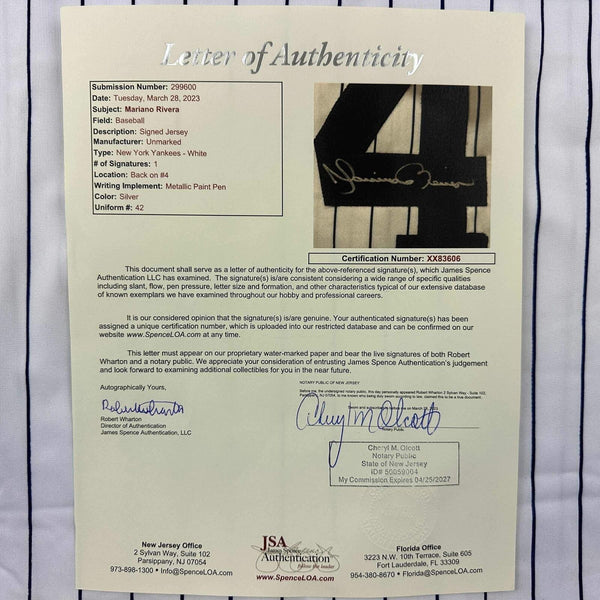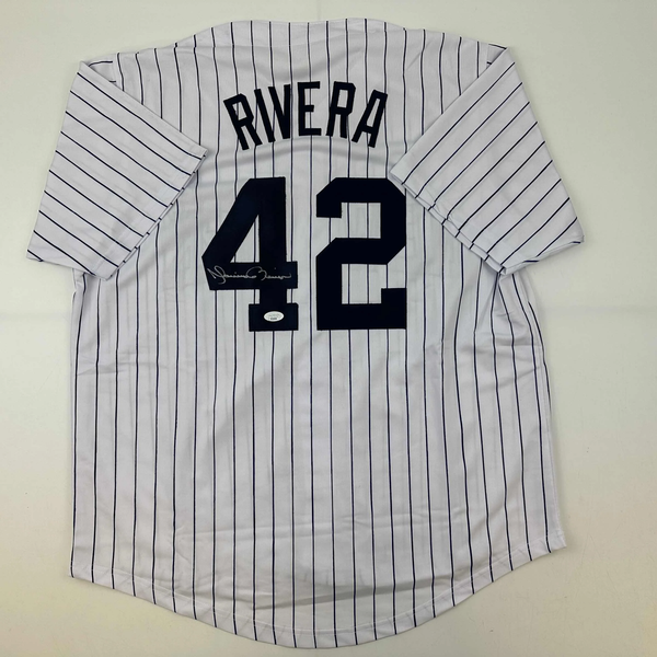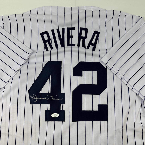 Autographed/Signed Mariano Rivera New York Pinstripe Baseball Jersey JSA COA/LOA Jersey has no brand names or logos. This is a custom jersey and was not manufactured by or in any manner associated with any professional sports league or manufacturer. This custom jersey carries no professional sports league designation. The item is intended to be an autographed collectible. The custom jersey displays the name and number of the player. This item in no way is affiliated with or connected to any professional sports organization. Size is XL.