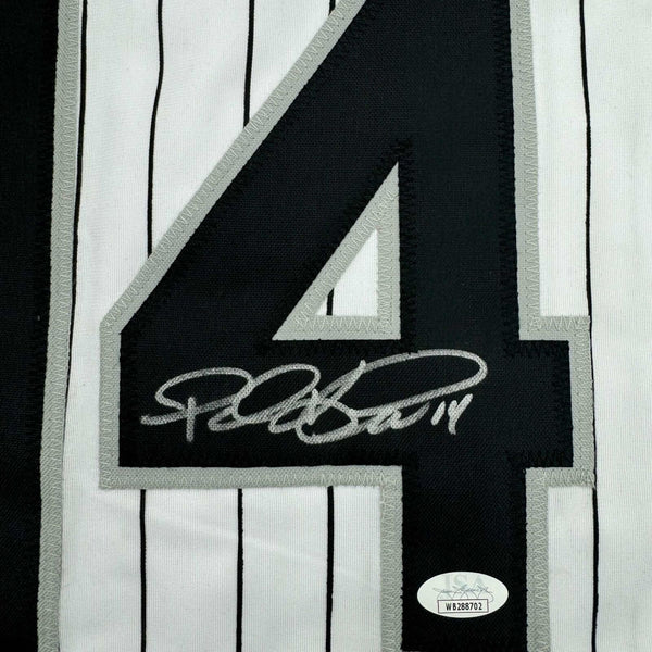 Autographed/Signed Paul Konerko Chicago Pinstripe Baseball Jersey JSA COA Jersey has no brand names or logos. This is a custom jersey and was not manufactured by or in any manner associated with any professional sports league or manufacturer. This custom jersey carries no professional sports league designation. The item is intended to be an autographed collectible. The custom jersey displays the name and number of the player. This item in no way is affiliated with or connected to any professional sports organization. Size is XL
