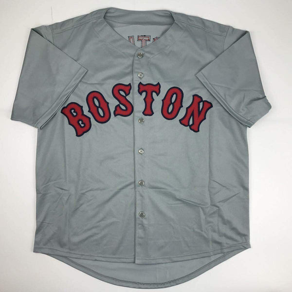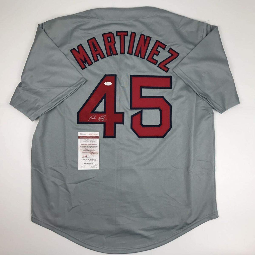 Autographed/Signed Pedro Martinez Boston Grey Baseball Jersey JSA COA Jersey has no brand names or logos. This is a custom jersey and was not manufactured by or in any manner associated with any professional sports league or manufacturer. This custom jersey carries no professional sports league designation. The item is intended to be an autographed collectible. The custom jersey displays the name and number of the player. This item in no way is affiliated with or connected to any professional sports organization. Size is XL.