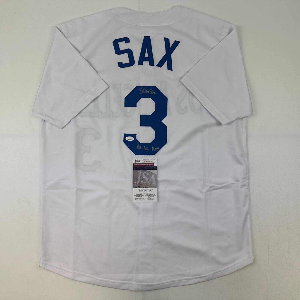Autographed/Signed Steve Sax Los Angeles LA White Baseball Jersey JSA COA Jersey has no brand names or logos. This is a custom jersey and was not manufactured by or in any manner associated with any professional sports league or manufacturer. This custom jersey carries no professional sports league designation. The item is intended to be an autographed collectible. The custom jersey displays the name and number of the player. This item in no way is affiliated with or connected to any professional sports organization. Size is XL.