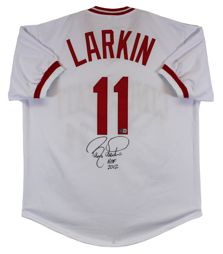 This Autographed White Pro Style Jersey with the inscription of "HOF '12" has been Personally Signed by Barry Larkin of the Cincinnatti Reds. This item is 100% Authentic to include a hologram by Beckett Authentication Services. This item will come with an affixed Beckett Authentication Services (BAS) authentication sticker, which includes a scannable QR code to verify authenticity. Please note that Beckett no longer provides serial-numbered COA cards, and the attached BAS sticker will serve as the complete authentication for this item. This is a BAS Witnessed Protection Program item which means a Beckett Authentication Service representative was present when this item was being signed. We conducted an autograph signing with Barry Larkin where multiples of the same item were signed. While the photographs are representative of this item, the size, placement and strength of the signature may vary. Each item is hand signed, therefore, each autograph is unique. This item can be verified through BAS Witnessed. This is a X-Large sized, non-branded, custom-stitched Jersey.