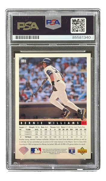 Featured is a Bernie Williams signed 1992 Upper Deck #332 trading card. This card has been hand signed by Williams and has been authenticated and encapsulated by PSA. This card would make a great addition to any sports memorabilia collection! SPECIFICATIONS Autographed By: Bernie Williams Team: New York Yankees Sport: Baseball Authentication: Professional Sports Authenticator (PSA)