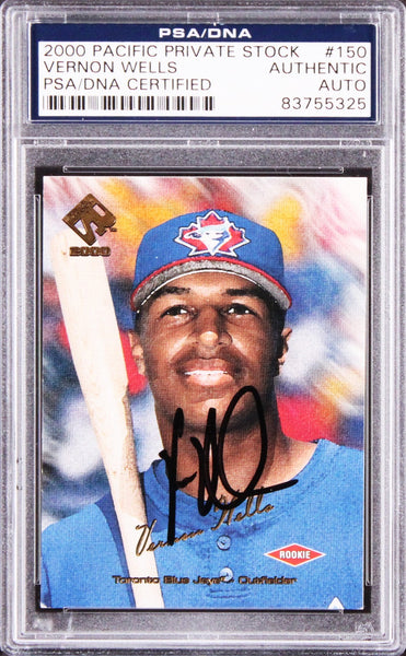 This Autographed 2000 Pacific Private sStock #150 Rookie Card has been Personally Signed by Vernon Wells of the Toronto Blue Jays. This item is 100% Authentic, it comes slabbed and authenticated by PSA/DNA. The authenticity can be verified on Professional Sports Authenticator website.