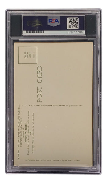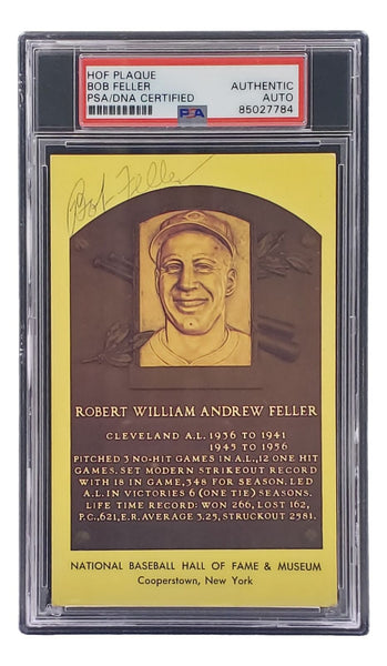 Featured is a Bob Feller Cleveland signed 4x6 Hall Of Fame plaque card. This card has been hand signed by Feller and has been authenticated and encapsulated by PSA/DNA. This card would make a great addition to any sports memorabilia collection! SPECIFICATIONS Autographed By: Bob Feller Team: Cleveland Sport: Baseball Authentication: Professional Sports Authenticator (PSA)