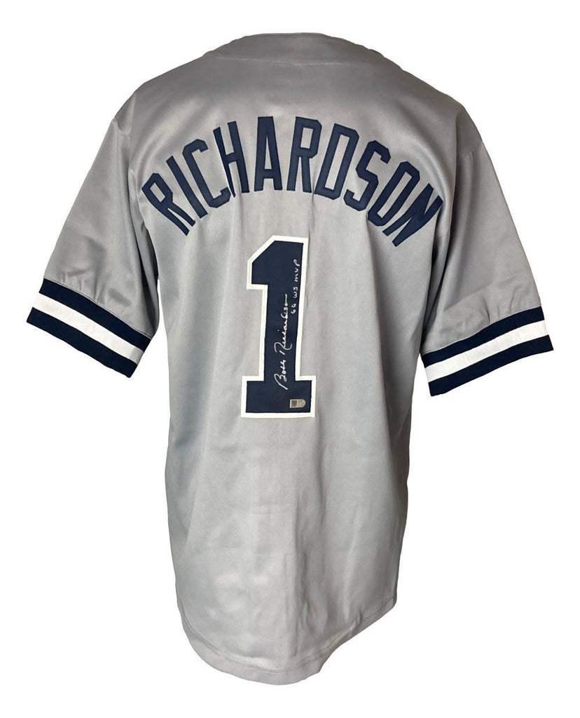 Featured is a Bobby Richardson signed custom baseball jersey, inscribed "60 WS MVP". This jersey has been hand signed by Richardson and comes with the Sports Integrity hologram and certificate of authenticity. This jersey features professionally sewn letters and numbers and is size XL. This jersey has no team tags or emblems and is intended as a sports collectible. This jersey would make a great addition to any sports memorabilia collection! SPECIFICATIONS Autographed By: Bobby Richardson Team: New York Yankees Sport: Baseball Authentication: James Spence Authentication (JSA)