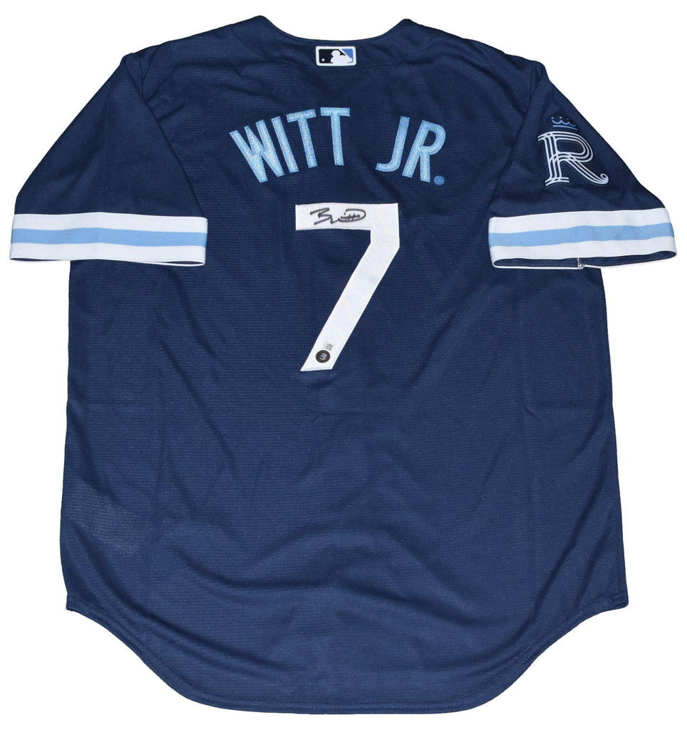 Bobby Witt Jr, All-Star shortstop for the Kansas City Royals, has hand signed this Royals navy Nike jersey at a private signing. Jersey is new with tags attached and all letters/numbers are sewn-on. This item is authenticated by Beckett Authentication Services and was signed in the presence of one of their representatives. Their tamper-evident hologram featuring a QR code and serial number is on the item. The authenticity can be verified online by entering the serial number or scanning the QR code.Item pictured may not be the exact item you will receive. It will be similar quality, and we guarantee your satisfaction.