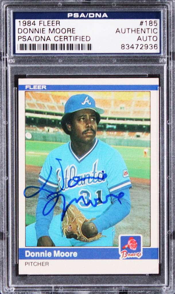 This Autographed 1984 Fleer #185 Card has been Personally Signed by Donnie Moore of the Atlanta Braves. This item is 100% Authentic, it comes slabbed and authenticated by PSA/DNA. The authenticity can be verified on Professional Sports Authenticator website.
