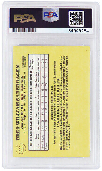 Bret Saberhagen signed Kansas City Royals 1985 Donruss rookie baseball trading cad #222. The card has been authenticated and encapsulated by PSA/DNA and the number can be verified online. The image of the item is a stock photo, as we may have multiples of the item in stock. The Slabbed Card you will receive will be of the card described. (Same grade, Same authentication) You may or may not receive the exact PSA serial number on the slab label shown in image.