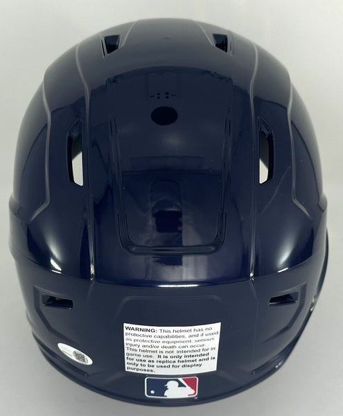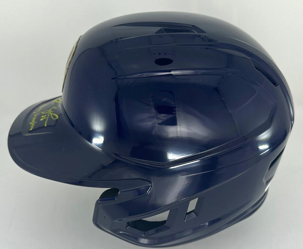 A hand signed Full Size Rawlings Replica Helmet of Milwaukee Brewers Infielder ANDREW VAUGHN. The signature is in Yellow paint pen with the inscription "King Vaughn". This item was signed at a private signing with us. This would make a great addition to any BREWERS collection! This item is guaranteed to be 100% authentic and will include a COA from JSA authentication.