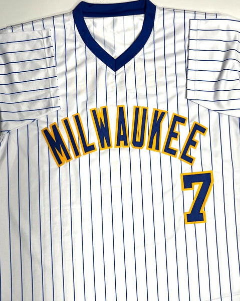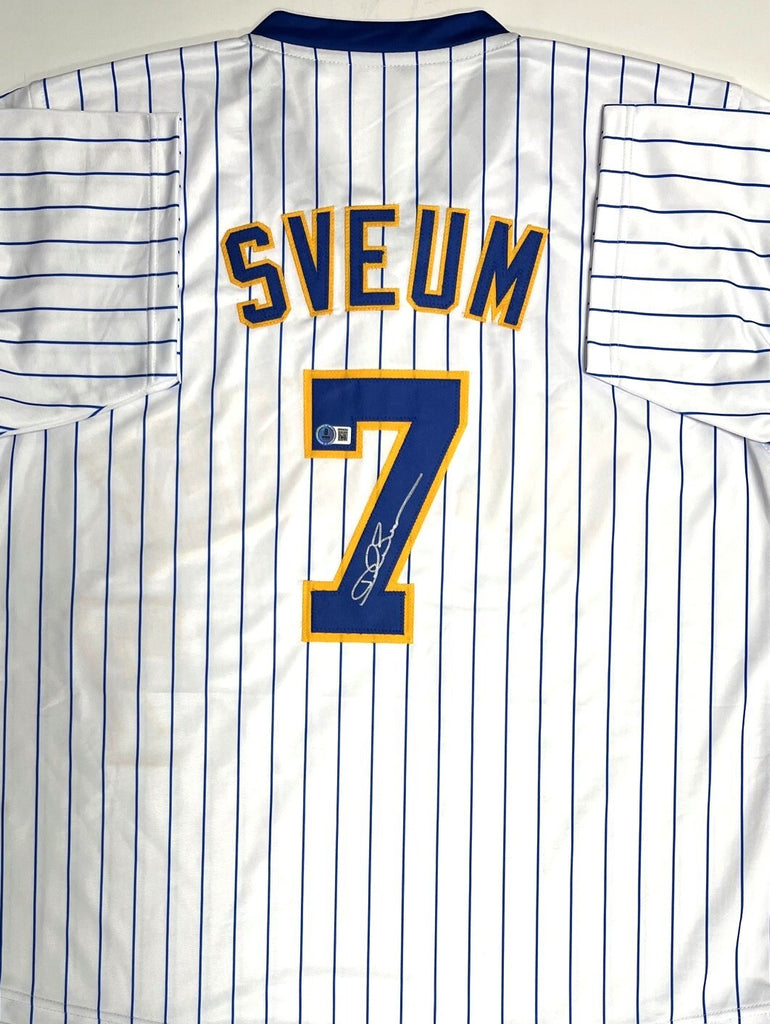 Custom Replica Jersey of former Milwaukee Brewers Infielder DALE SVEUM. This jersey is signed with Silver Paint Pen. This jersey is size XL with all letters and numbers sewn in. This item was signed at a signing in our store and would make a great addition to any Brewers collection. This autograph is guaranteed to be 100% authentic and will include a COA hologram from Beckett Authentication.