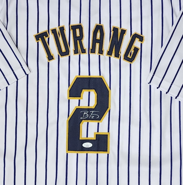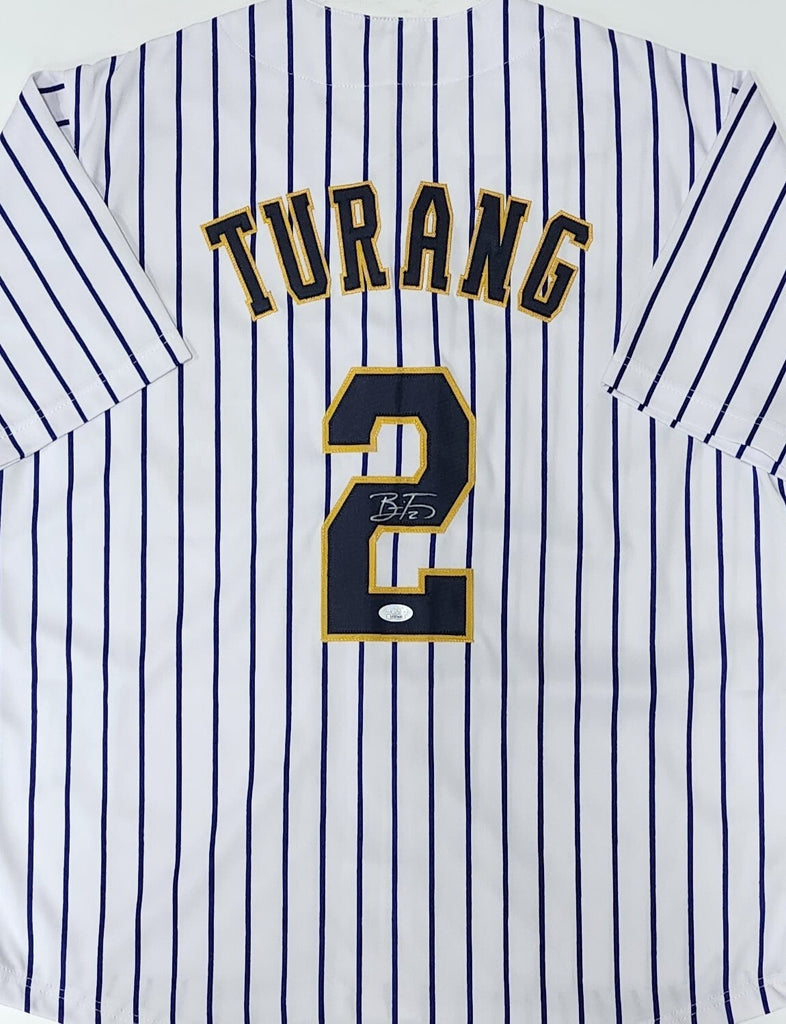 Custom replica jersey of Milwaukee Brewers Infielder BRICE TURANG. This jersey is signed with Silver Paint Pen and is size XL with all letters and numbers sewn in. This item was signed at a private signing in our store and would make a great addition to any Brewers collection. This autograph is guaranteed to be 100% authentic and will include a COA from JSA (James Spence Authentication).