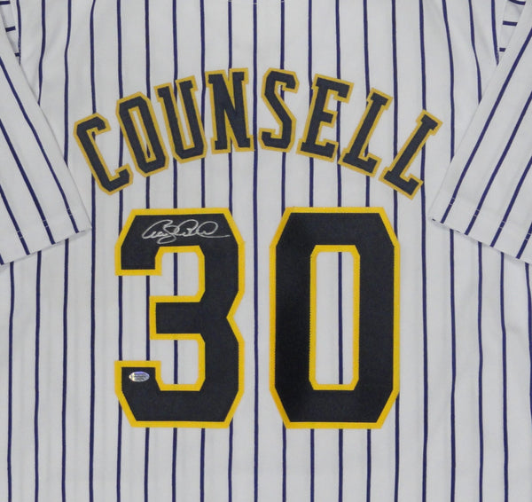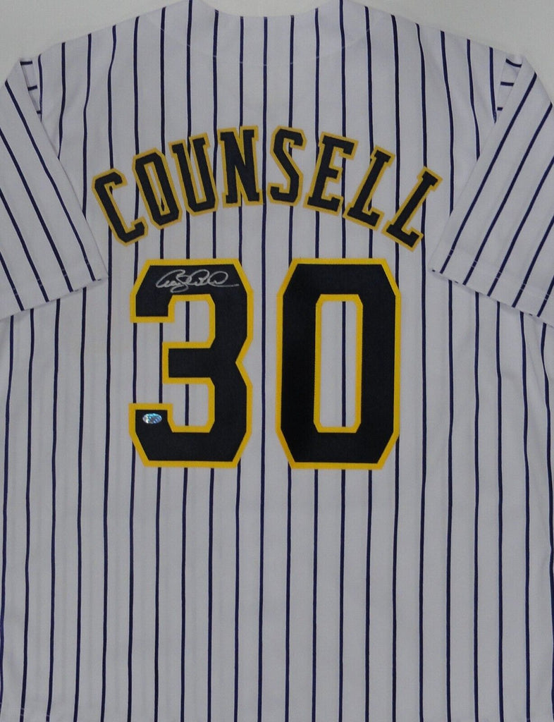 Custom replica jersey of Milwaukee Brewers Manager CRAIG COUNSELL. This jersey is signed with Silver Paint Pen and is size XL with all letters and numbers sewn in. This item was signed at a private signing in our store and would make a great addition to any Brewers collection. This autograph is guaranteed to be 100% authentic and will include a COA from Waukesha Sportscards with matching serial numbered holograms.