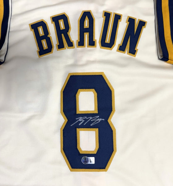 CUSTOM REPLICA JERSEY by Milwaukee Brewers Outfielder RYAN BRAUN. This jersey is signed with a silver paint pen. This Custom made jersey is size XL with all letters and numbers sewn in. This item was signed at a signing in our store and would make a great addition to any Brewers collection. This autograph is guaranteed to be 100% authentic and will include a COA hologram from Beckett Authentication.
