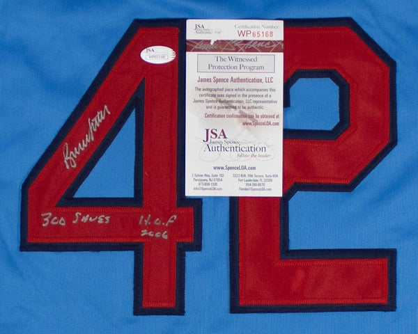 This custom on-field style adult XL autographed jersey has been personally hand-signed by Bruce Sutter of the St. Louis Cardinals. When signing, Sutter inscribed "300 Saves" and "H.O.F. 2006" along with his signature.This autograph is certified by James Spence Authentication's (JSA) Witnessed Protection Program. That means that a JSA representative was present when this item was signed. It comes with the numbered hologram and matching Certificate of Authenticity.Custom on-field style jerseys are a more affordable option for autograph seekers. These jerseys do not have any brand name or tags and are made in the Philippines. They feature stitched on names and numbers and are made to look very similar to the on-field jerseys that the players wear. These custom jerseys are very commonly used in the memorabilia industry.