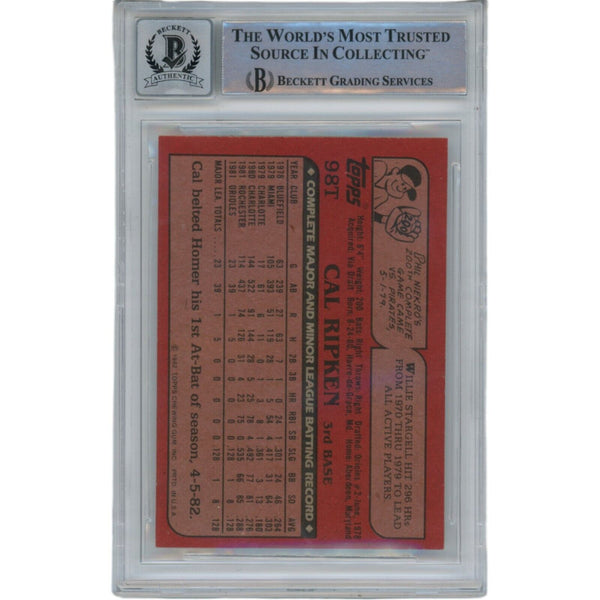The number in the listing title is just an inventory sku for our records and is not the authentication number. The item pictured is the exact item you will receive, please see photos for condition. This is a Baltimore Orioles 1982 Topps Traded #98T Slabbed Trading Card with a Grade 10 Autograph that was personally autographed by Cal Ripken Jr. Includes a certificate of authenticity from Beckett Grading Services (BAS) and Denver Autographs.