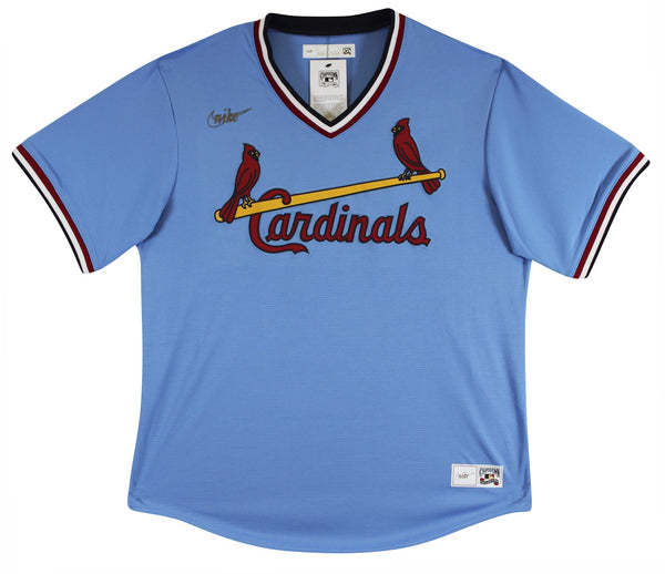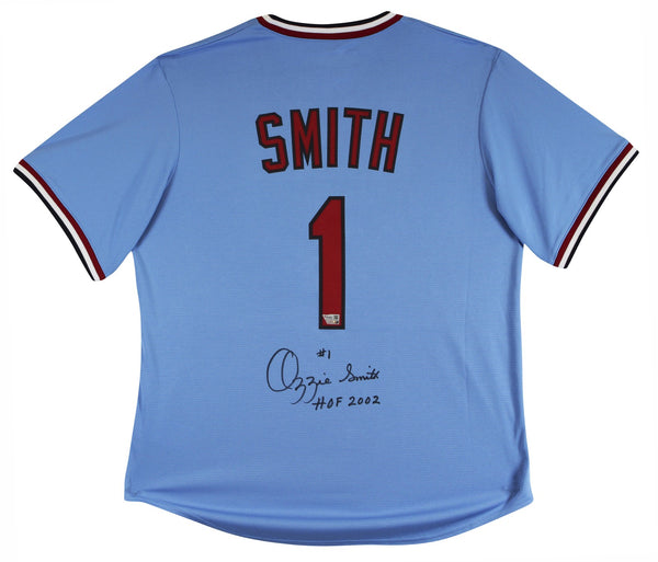 This Autographed Light Blue Nike Jersey has been Personally Signed by Ozzie Smith of the St. Louis Cardinals. This item is 100% Authentic to includes a numbered hologram by Fanatics. We conducted an autograph signing with Ozzie Smith where multiples of the same item were signed. While the photographs are representative of this item, the size, placement and strength of the signature may vary. Each item is hand signed, therefore, each autograph is unique. This item can be verified through Fanatics. This is a X-Large sized Jersey.