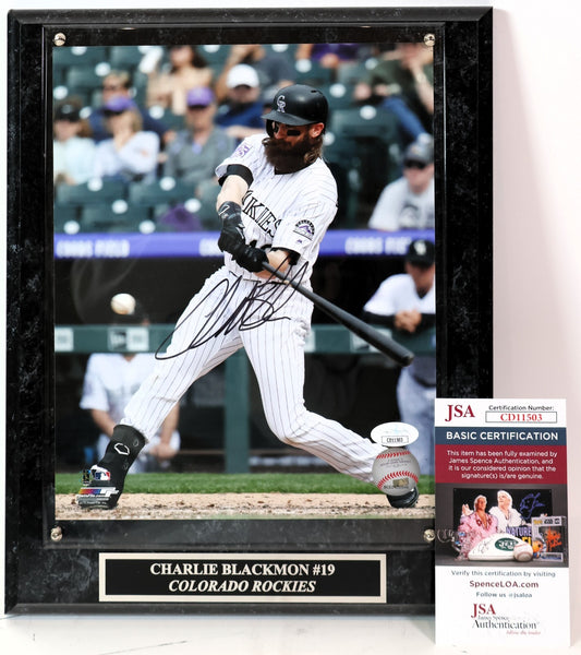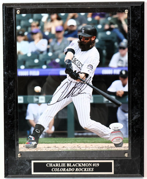 The product is an autographed 8x10 photo of Charlie Blackmon from the Colorado Rockies, featuring a plaque. The autograph is authenticated by James Spence Authentication (JSA). This unique item is an original piece, making it a valuable collectible for fans of baseball and the Colorado Rockies. The photo provides a personal touch with Blackmon's signature, adding to its appeal for collectors looking to own a piece of memorabilia from the player.
