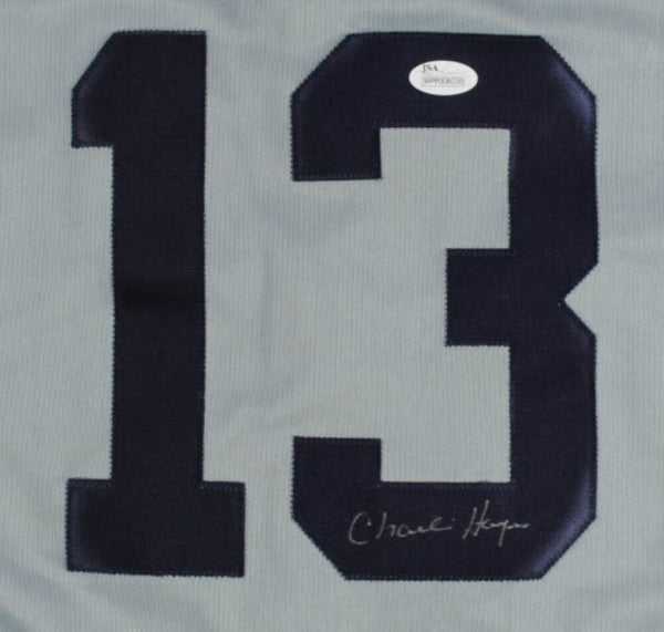 Custom on-field style jersey. Everything is sewn on, size XL. Hand-signed in silver paint pen by Charlie Hayes.The lot / autograph(s) includes an official James Spence Authentication (JSA) hologram and matching COA for authenticity purposes. The signing of this item was witnessed by JSA.Authentication: JSA COA