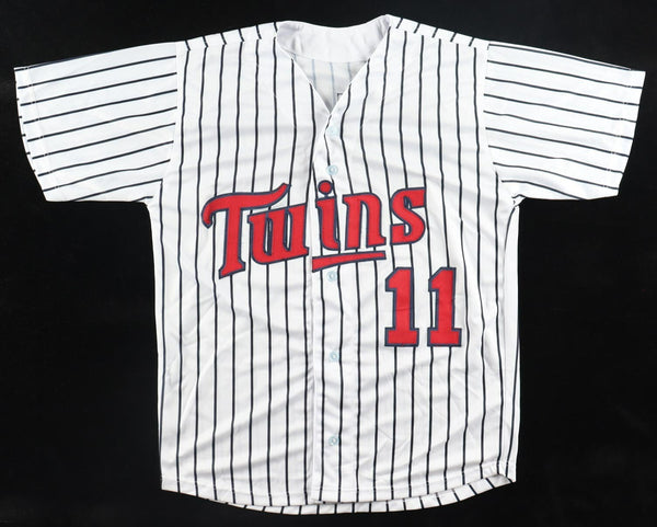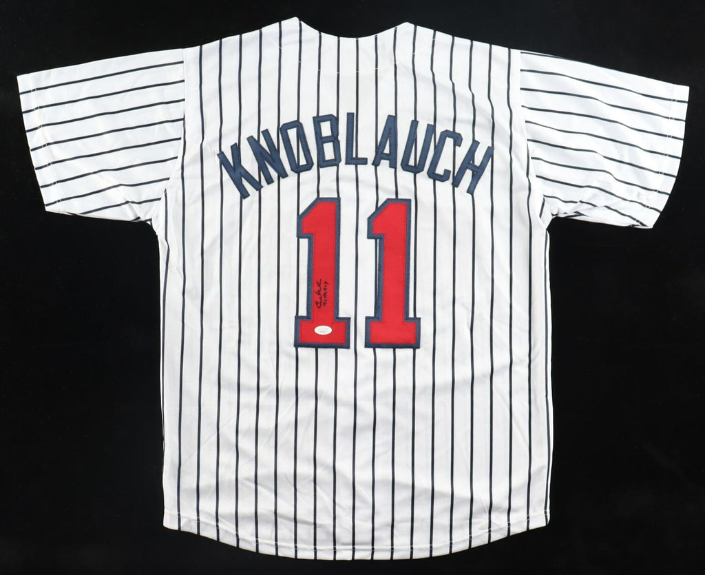 Custom on-field style jersey. Everything sewn on, size XL. Hand signed in silver paint pen by Chuck Knoblauch. The autograph(s) includes an official James Spence Authentication (JSA) hologram and matching COA for authenticity purposes. The signing of this item was witnessed by JSA.Authentication: JSA COA