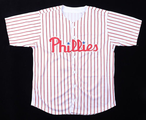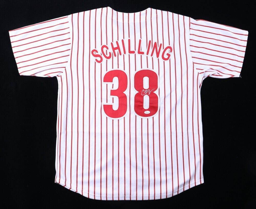 Custom on-field style jersey. Everything sewn on, size XL. Hand-signed by Curt Schilling. Please note, the back of the jersey has damage and the front of the jersey is stained. The autograph includes an official James Spence Authentication (JSA) hologram and QR Code Card for authenticity purposes. The signing of this item was witnessed by JSA.Authentication: JSA Hologram and QR Code Card