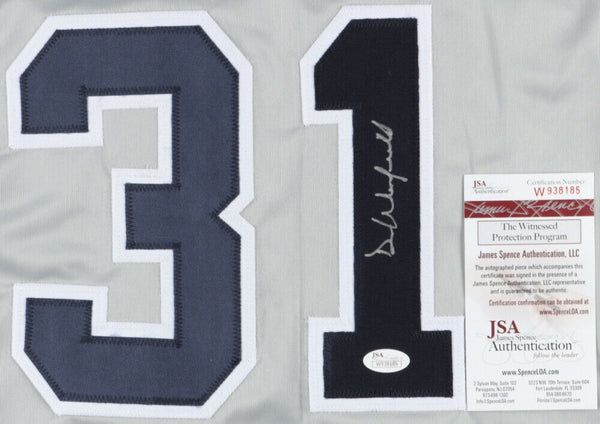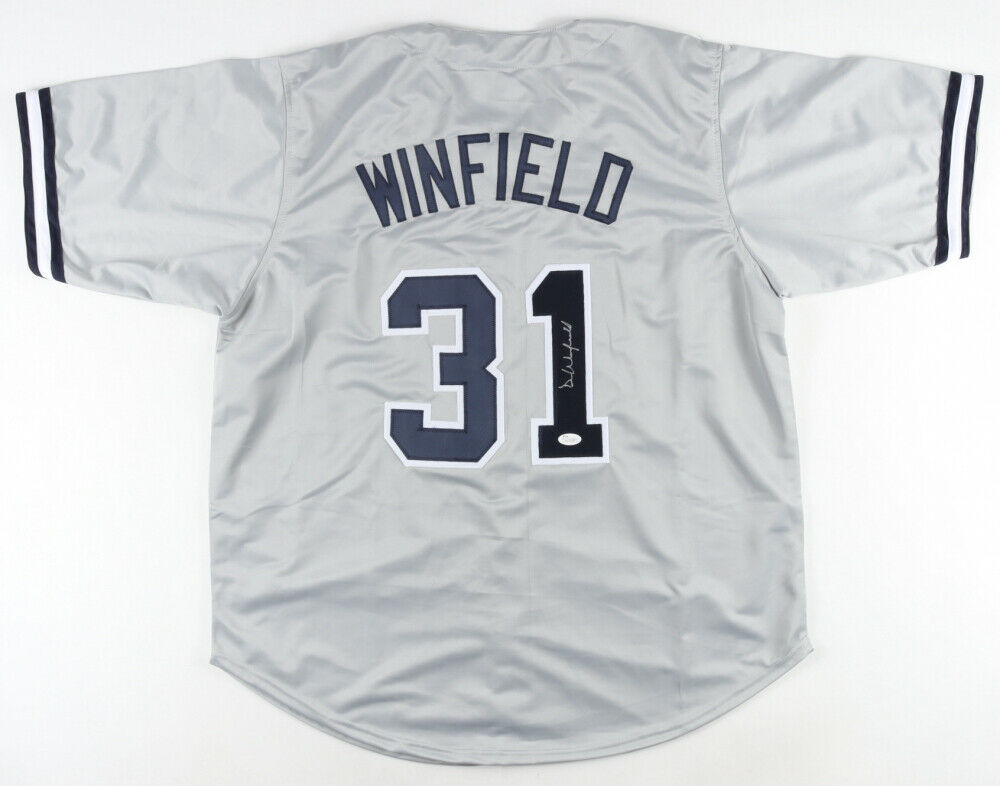 Custom on-field style jersey. Everything is sewn on, size XL. Jersey has been hand-signed in silver paint pen by Dave Winfield (HOF). The lot / autograph(s) includes an official James Spence Authentication (JSA) hologram and matching COA for authenticity purposes. The signing of this item was witnessed by JSA.Authentication: JSA COA