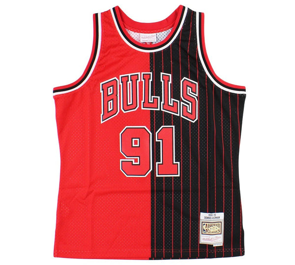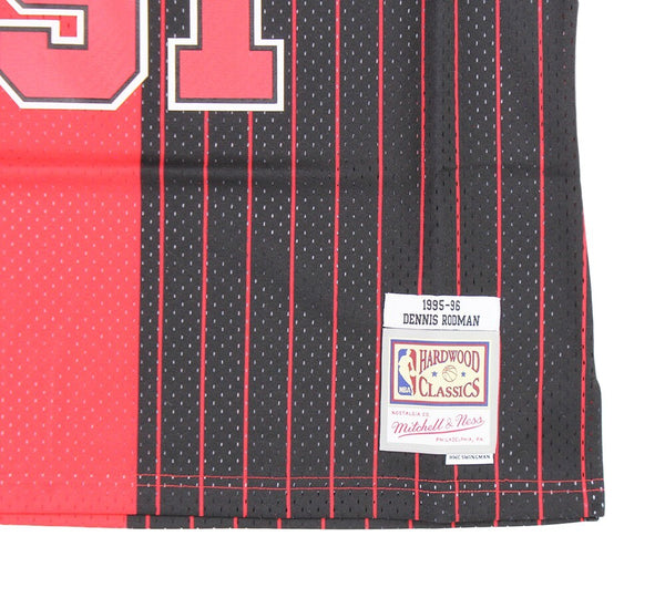 A Chicago Bulls Mitchell & Ness 1995-96 Swingman Split NBA Jersey hand signed by Dennis Rodman. The item and signature are in excellent condition. Dennis Rodman is a former pro basketball player. Dennis is a 5x NBA Champion, 2x NBA All-Star, and 2x NBA Defensive Player of the Year. AUTHENTICATION: The item is accompanied by a JSA Certificate of Authenticity - JSA Serial Numbered Hologram -