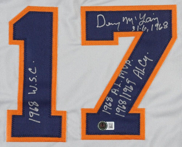 Custom on-field style jersey. Everything sewn on, size XL. Hand-signed and 4 times inscribed in silver paint pen by Denny McClain (Detroit Tigers). The lot / autograph(s) includes an official Beckett Authentication Services serially numbered hologram and QR Code card for authenticity purposes. The signing of this item was witnessed by Beckett.Authentication: Beckett Hologram with QR Code card