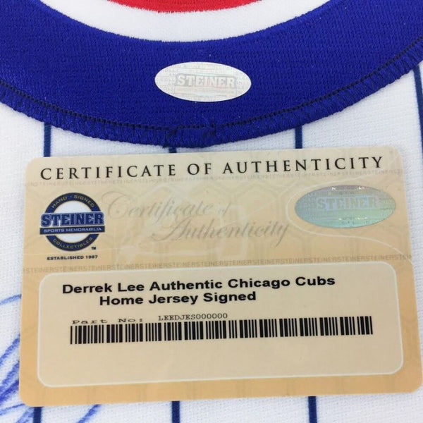 Custom on-field style jersey. Everything is sewn on, size 48. Hand-signed in blue felt-tip pen by Derrek Lee. The lot / autograph(s) includes an official Steiner Sports hologram and matching COA for authenticity purposes.Authentication: Steiner COA