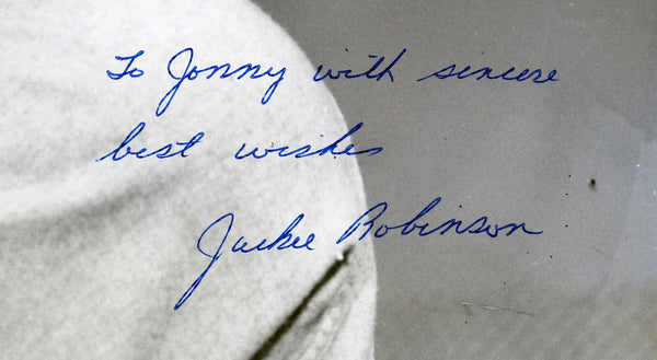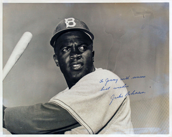 This Autographed 11x14 Photo with the inscription of "To Jonny with sincere best wishes" has been Personally Signed by Jackie Robinson of the Brooklyn Dodgers. This item is 100% Authentic and comes with a PSA/DNA Certification Card and a matching numbered Hologram. The authenticity can be verified on Professional Sports Authenticator website. The signature and inscription are located on his image at and to the right of his left shoulder. The photo is in good overall condition displaying minor corner and edge wear and some toning due to age.