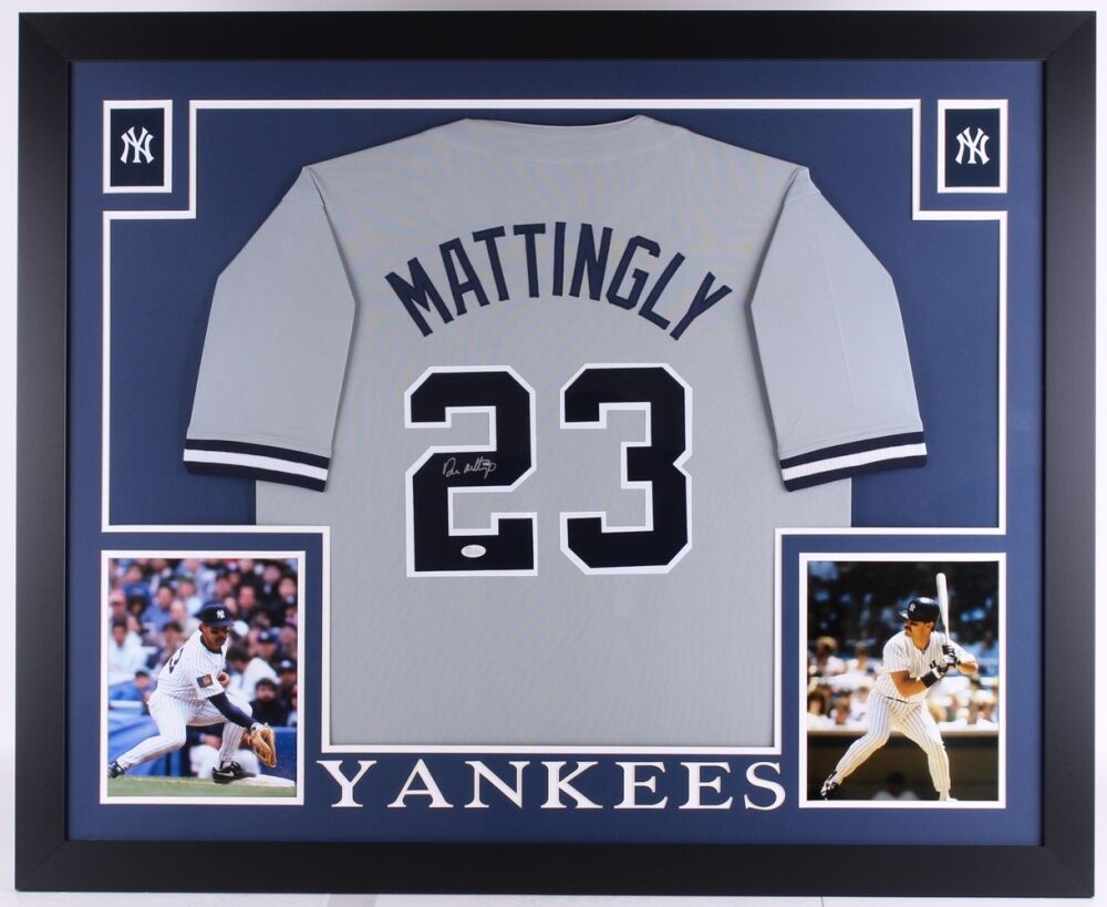 Custom frame measures approximately 35" x 43" in size and features a jersey which has been hand-signed in silver paint pen by Don Mattingly. The autograph includes an official James Spence Authentication (JSA) hologram and matching COA for authenticity purposes. The signing of this item was witnessed by JSA.Authentication: JSA COA
