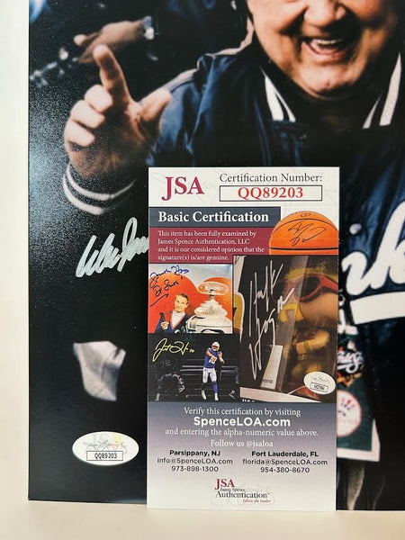 The product is an autographed photo of Don Zimmer in an army helmet, featuring his signature and authenticated by James Spence Authentication (JSA). This unique item is a valuable collector's piece for fans of the New York Yankees baseball team, showcasing a rare and authentic autograph from the legendary player. Perfect for sports memorabilia enthusiasts looking to add a special piece to their collection, this photo captures a moment in baseball history with a personal touch from the iconic Don Zimmer.