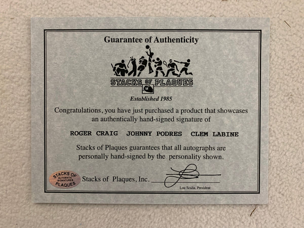 This photo of Ebbets Field is signed by Roger Craig, Johnny Podres, and Clem Labine. Roger Craig is an American former pitcher, coach, and manager in Major League Baseball (MLB). Craig played for five National League teams over all or parts of 12 seasons (1955-1966)--most notably as a member of the Brooklyn and Los Angeles Dodgers, and New York Mets--and then forged a successful post-playing career as a pitching coach and manager. Johnny Podres was an American left-handed pitcher in Major League Baseball who spent most of his career with the Brooklyn / Los Angeles Dodgers. Clem Labine was an American right-handed relief pitcher in Major League Baseball best known for his years with the Brooklyn and Los Angeles Dodgers from 1950 to 1960. This photo comes with a Certificate of Authenticity from Stacks of Plaque and includes a tamper-resistant hologram on the photo. This process helps to ensure the product is authentic. Latitude Sports Marketing has been in business since 2005 and is one of the leading memorabilia companies in the Rocky Mountain region.