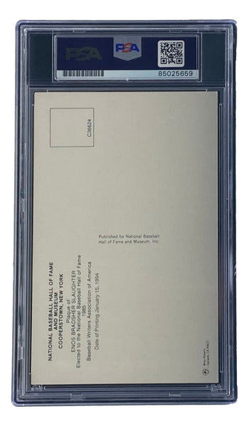 Featured is a Enos Slaughter (St. Louis Cardinals) signed 4x6 Hall Of Fame plaque card. This card has been hand signed by Slaughter and has been authenticated and encapsulated by PSA/DNA. This card would make a great addition to any sports memorabilia collection!. SPECIFICATIONS Autographed By: Enos Slaughter Team: St. Louis Cardinals Sport: Baseball Authentication: Professional Sports Authenticator (PSA)