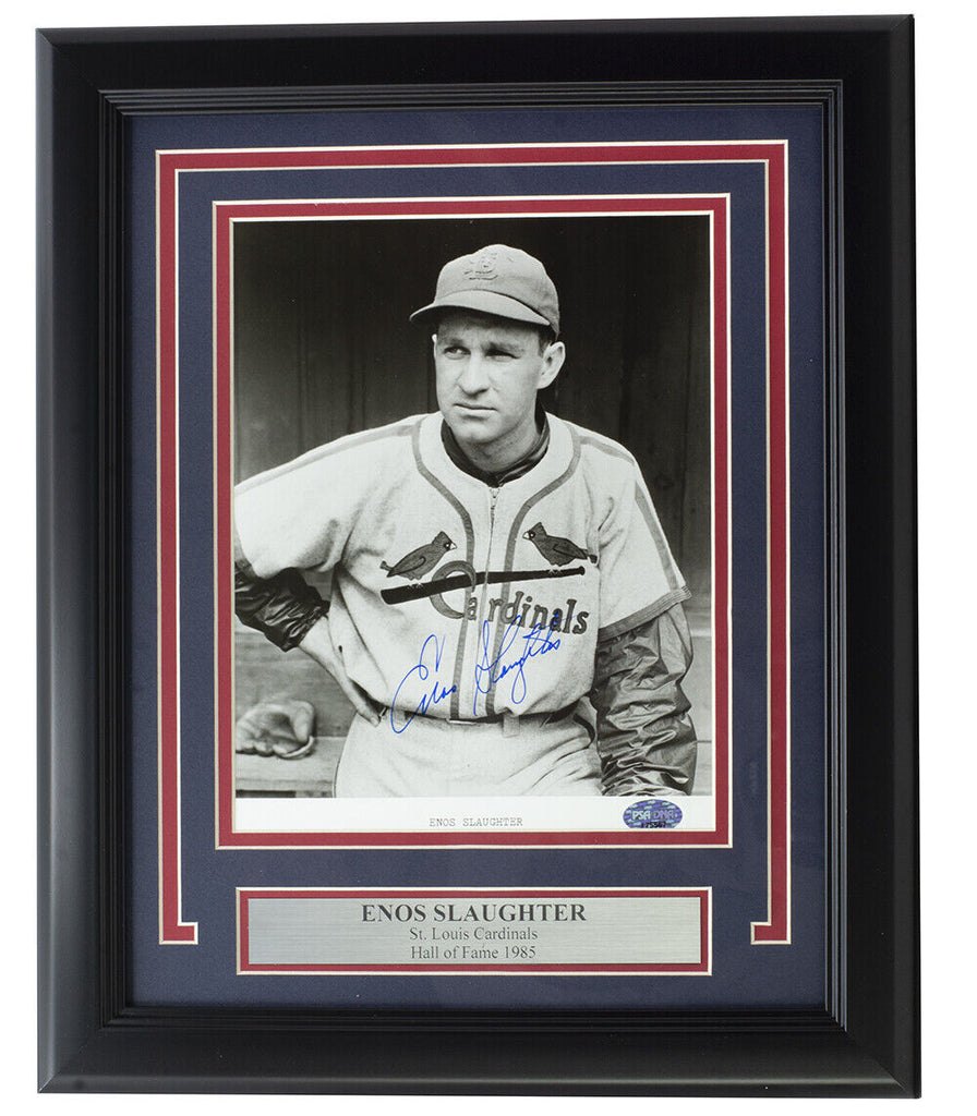 Featured is a Enos Slaughter signed framed St. Louis Cardinals 8x10 baseball photo. This photo was hand signed by Enos Slaughter and has been authenticated by PSA/DNA authentication services. Included with the photo is a PSA/DNA hologram and certificate of authenticity. Professionally framed and matted. Measures approximately 11x14 inches in total size, ready for display. SPECIFICATIONS Autographed By: Enos Slaughter Team: St. Louis Cardinals Sport: Baseball Authentication: Professional Sports Authenticator (PSA)