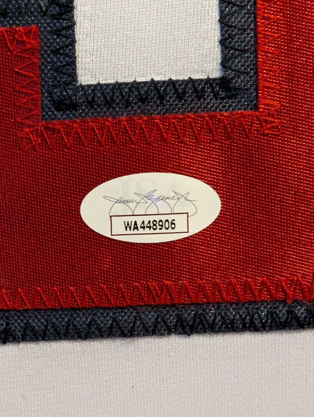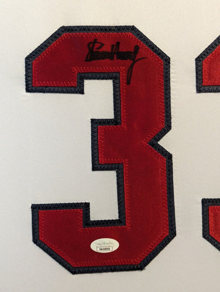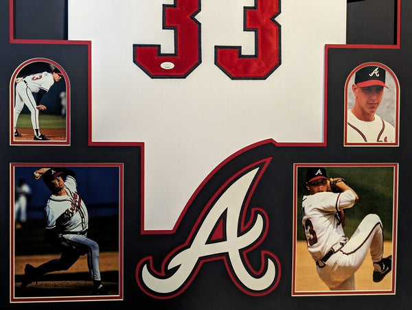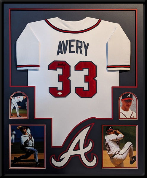 Custom Framed Steve Avery hand signed Atlanta Braves style custom jersey.JSA COAThe authentication is from JSA. This signature is WITNESSED by a representative of JSA! 100% AUTHENTIC! The jersey has fully stitched numbers on the front and back. It is a great item and a must for all great sports fans!This item is professionally framed, it measures 32"x40" inside , 42"x34" outside , using UV protective Acrylic glass for safe keeping and safe transport, team color matting, black moulding and hanging hooks on the back. All additional items in frame seen in pictures included. 100% ready to hang in your fan cave.