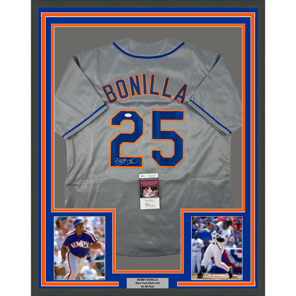 Framed Autographed/Signed Bobby Bonilla 33x42 New York Grey Jersey JSA COA The item is professionally framed and matted with two 5x7 photos, measures 35 inches by 39 inches and is ready to be hung in your man cave! Photo and matting requests can be made.