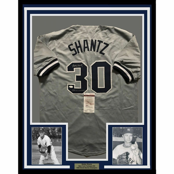 FRAMED Autographed/Signed BOBBY SHANTZ 33x42 New York Baseball Jersey JSA COA The item is professionally framed & matted with two 8x10 photos, measures 33"x42" and is ready to be hung in your man cave! NOTE: COA card will be mounted on the back of the frame, not inside it on top of the jersey as seen in the picture. Photo and matting requests can be made.