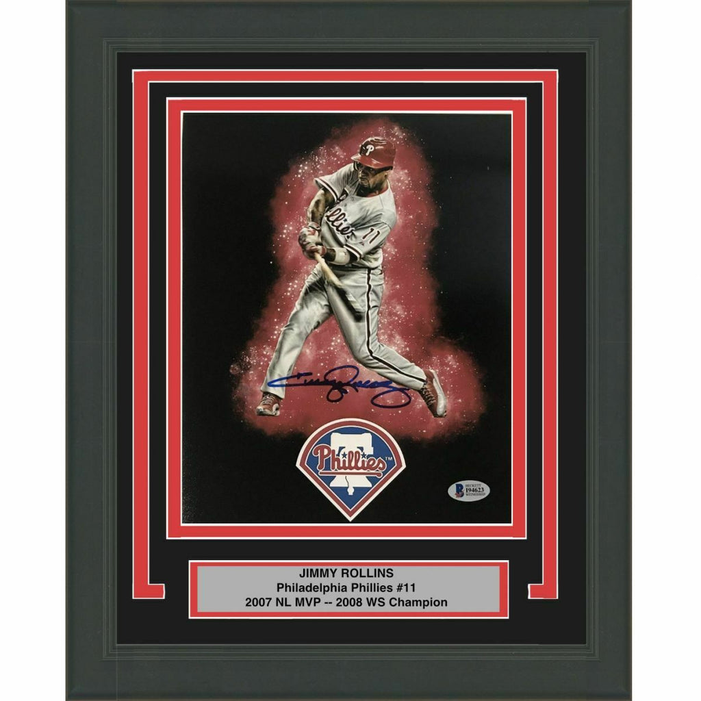 FRAMED Autographed/Signed JIMMY ROLLINS Phillies 8x10 Photo Beckett BAS COA #2 The item is professionally framed & matted and is ready to be hung in your man cave! NOTE: COA card, if applicable, will be mounted on the back of the frame. Please allow up to 5 business days for the item to be framed, packaged safely, and picked up by USPS. Nameplate and matting requests can be made.