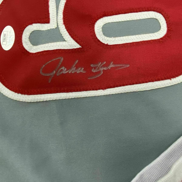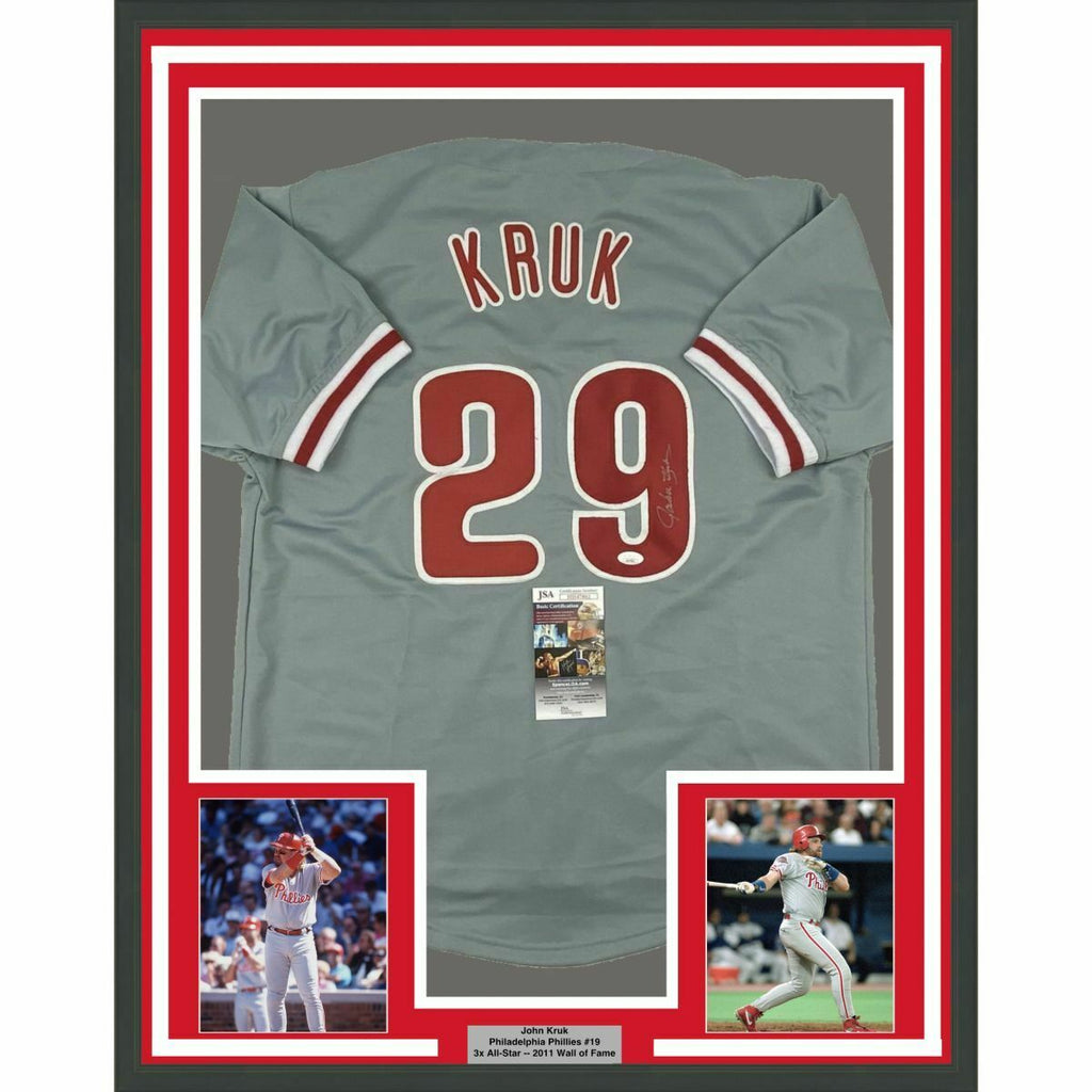 FRAMED Autographed/Signed JOHN KRUK 33x42 Philadelphia Grey Jersey JSA COA Auto The item is professionally framed & matted with two 8x10 photos, measures 33"x42" and is ready to be hung in your man cave! NOTE: COA card will be mounted on the back of the frame, not inside it on top of the jersey as seen in the picture.