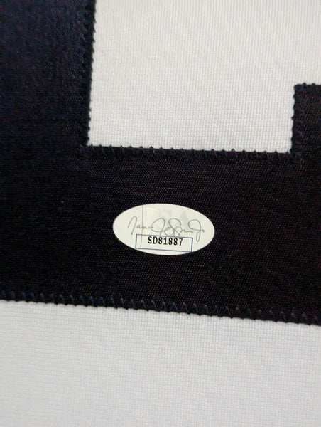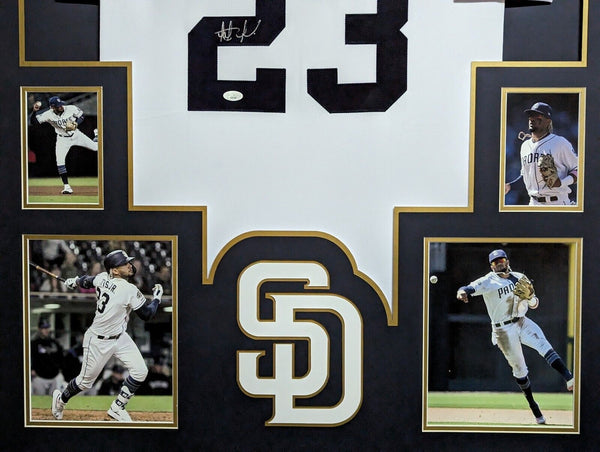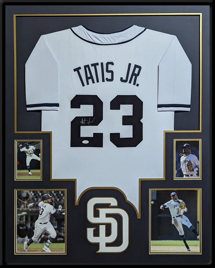 Custom Framed Fernando Tatis Jr hand signed San Diego Padres style custom jersey.JSA COAThe authentication is from JSA. This signature is WITNESS authenticated by a representative of JSA! 100% AUTHENTIC!!! The jersey has fully stitched numbers on the front and back. It is a great item and a must for all great sports fans!This item is professionally framed, it measures 32"x40" inside , 42"x34" outside , using UV protective Acrylic glass for safe keeping and safe transport, team color matting, black moulding and hanging hooks on the back. All additional items in frame seen in pictures included. 100% ready to hang in your fan cave.