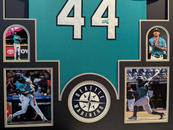 Custom Framed Julio Rodriguez hand signed Seattle Mariners style custom jersey.JRODSHOW JerseyJSA COAThe authentication is from JSA. This signature is WITNESSED by a representative of JSA! 100% AUTHENTIC!!! The jersey has fully stitched numbers on the front and back. It is a great item and a must for all great sports fans!This item is professionally framed, it measures 32"x40" inside , 42"x34" outside , using UV protective Acrylic glass for safe keeping and safe transport, team color matting, black moulding and hanging hooks on the back. All additional items in frame seen in pictures included. 100% ready to hang in your fan cave.