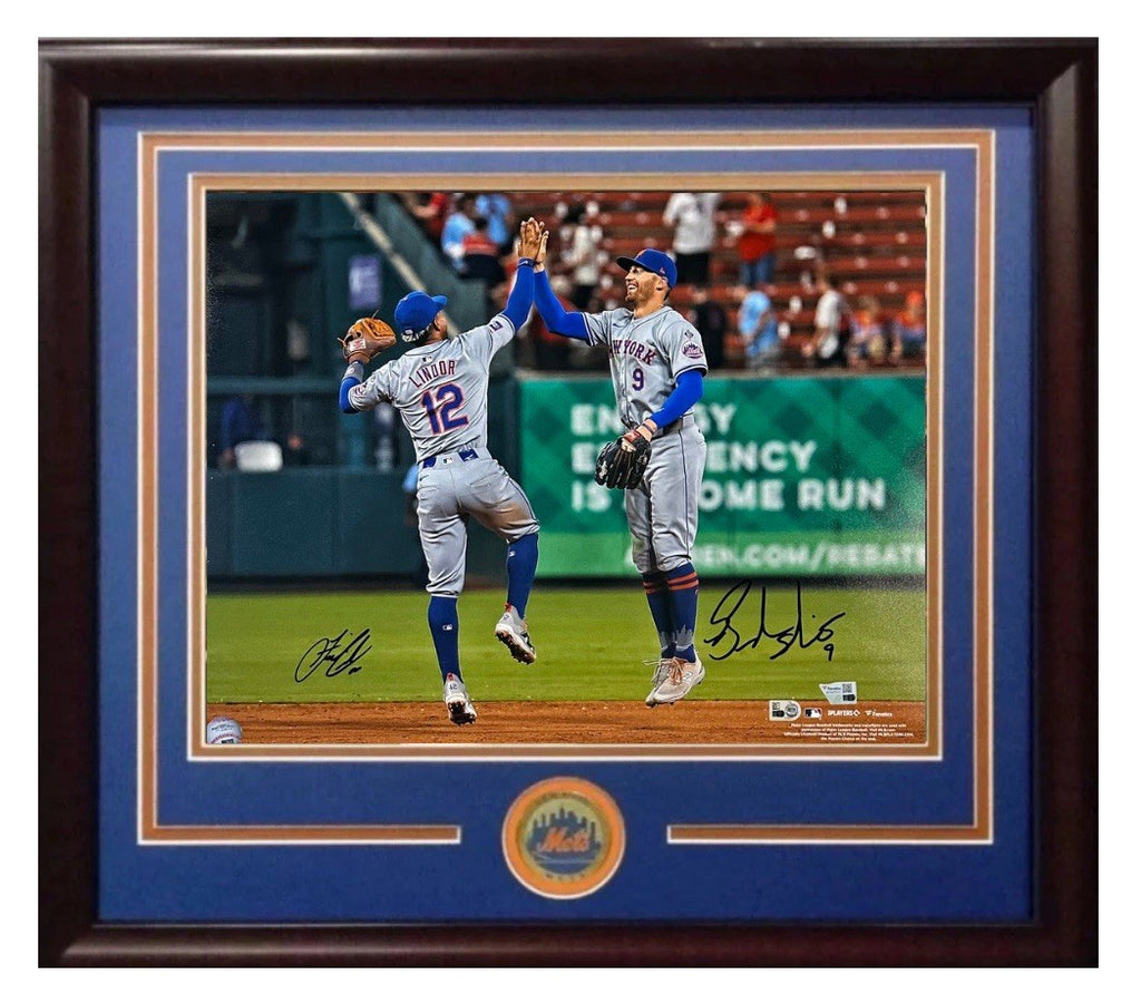 Francisco Lindor and Brandon Nimmo Dual signed 16x20 framed photo. Hand signed in bold black by the Mets stars. Framed in cherrywood with Mets colored matting and a Mets coin. Final framed dimensions are 25x27. Comes ready to hang.