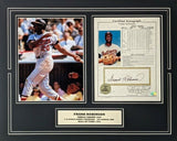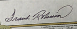This autographed career stats sheet, featured in a matted display measuring 16" x 20" has been personally hand-signed by Frank Robinson of the Cincinnati Reds and Baltimore Orioles. This autograph is certified by Stacks of Plaques (SOP). It comes with the Stacks of Plaques authentication hologram and Certificate of Authenticity.** The cardboard backing is affixed to its matted display.