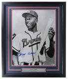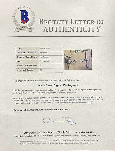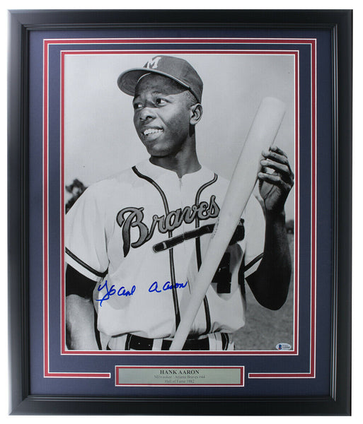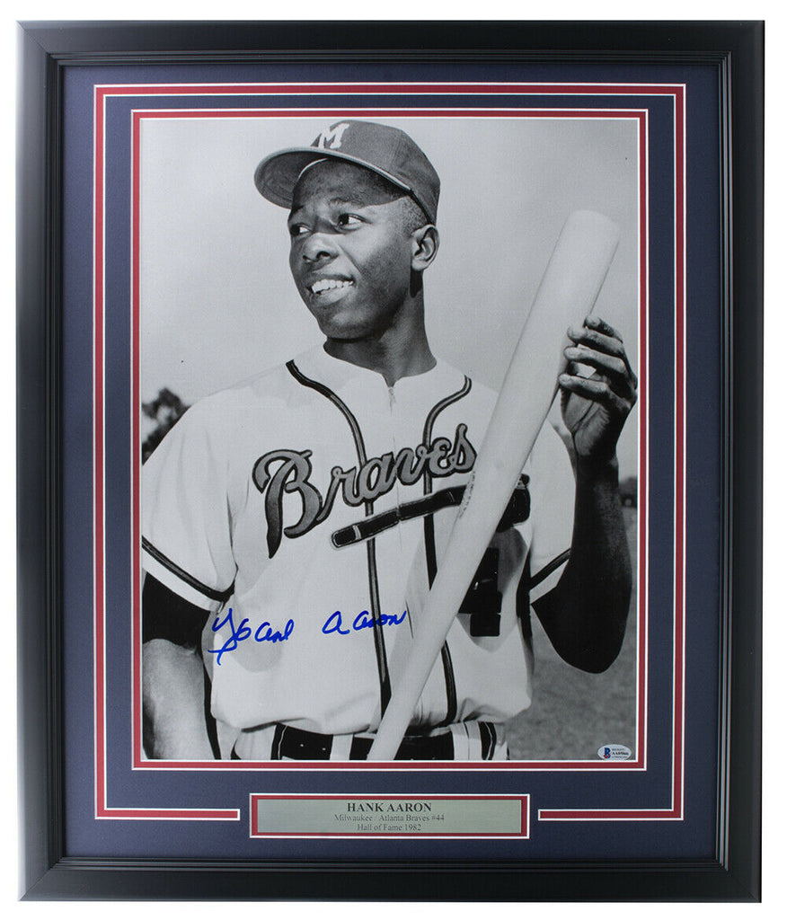 Featured is a Hank Aaron signed framed 16x20 Atlanta Braves baseball photo. This photo was hand signed by Hank Aaron and authenticated by Beckett authentication services. Included with the frame is a Beckett hologram and letter of authentication in which they graded the autograph a 10. This item would make a great addition to any sports memorabilia collection. SPECIFICATIONS Autographed By: Hank Aaron Team: Atlanta Braves Sport: Baseball-MLB Authentication: Beckett Grading Services