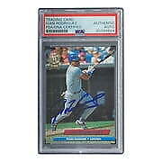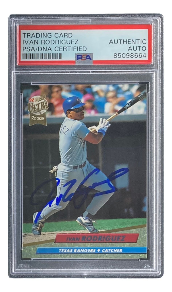 Featured is an Ivan Rodriguez Texas Rangers signed 1992 Fleer #139 rookie card. This card has been hand signed by Rodriguez and has been authenticated and encapsulated by PSA. This card would make a great addition to any sports memorabilia collection!. SPECIFICATIONS Autographed By: Ivan Rodriguez Team: Texas Rangers Sport: Baseball Authentication: Professional Sports Authenticator (PSA)