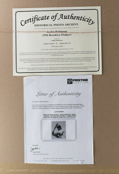 Jackie Robinson was the first African American to play in Major League Baseball in the modern era. While playing most of his remarkable professional career for the Brooklyn Dodgers, he challenged the traditional basis of segregation and contributed significantly to the Civil Rights Movement. This Limited Edition Fine Art Giclee is printed on acid-free museum quality paper with a hand-torn deckled edge. It is hand-titled, hand-numbered. Edition size is limited to 375 pieces. Measures approximately 10" x 14.5" in size. This giclee has been professionally framed and matted and is approximately 17x22. This giclee comes with an official Historical Photo Archive letter. SPECIFICATIONS Autographed By: Team: Brooklyn Dodgers Sport: Baseball Authentication: