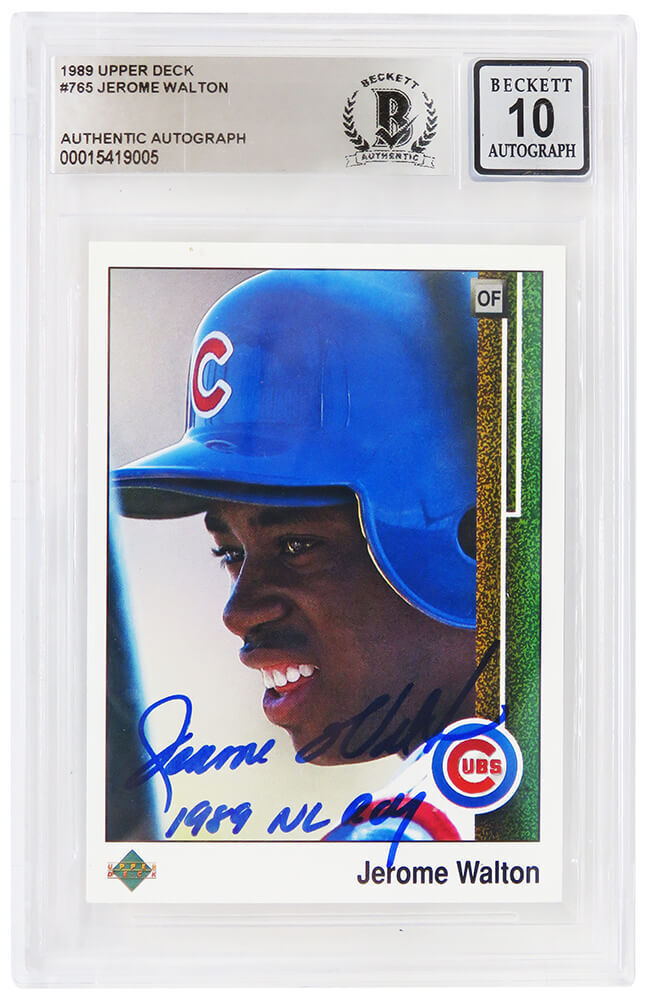 Jerome Walton signed Chicago Cubs 1989 Upper Deck rookie baseball trading card #765 with '1989 NL ROY' inscription. The card has been authenticated and encapsulated by Beckett Authentic and the autograph has been graded a Mint 10. The authentication number can be verified online. Only the autograph has been graded a 10 by Beckett Authentic, the card itself is ungraded. The image of the item is a stock photo, as we may have multiples of the item in stock. The Slabbed Card you will receive will be of the card described. (Same grade, Same authentication) You may or may not receive the exact Beckett serial number on the slab label shown in image.