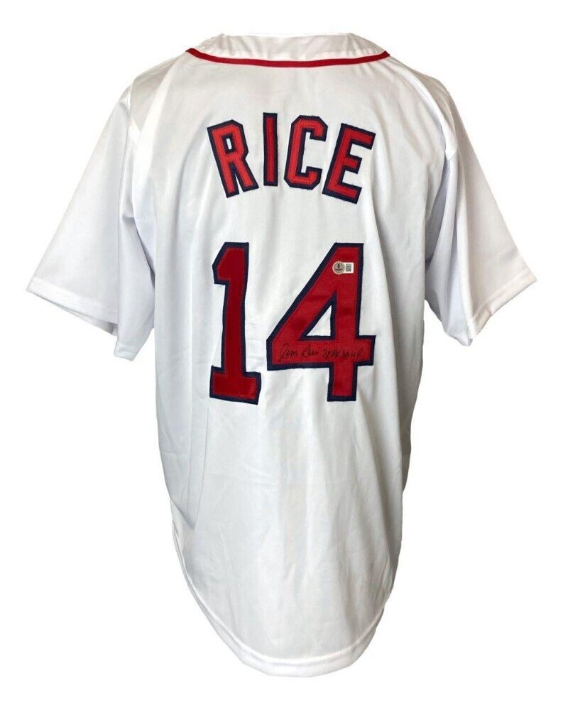 This autographed jersey has been personally hand-signed and inscribed by Jim Rice of the Boston Red Sox.The autograph includes an official Beckett Authentication Services serially numbered hologram and QR Code card for authenticity purposes.Authentication: Beckett Hologram with QR Code cardCustom on-field style jerseys are a more affordable option for autograph seekers. These jerseys do not have any brand name or tags and are made in the Philippines. They feature stitched on names and numbers and are made to look very similar to the on-field jerseys that the players wear. These custom jerseys are very commonly used in the memorabilia industry.