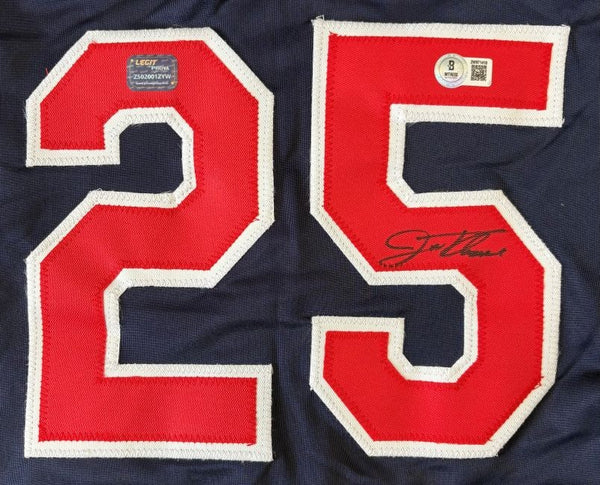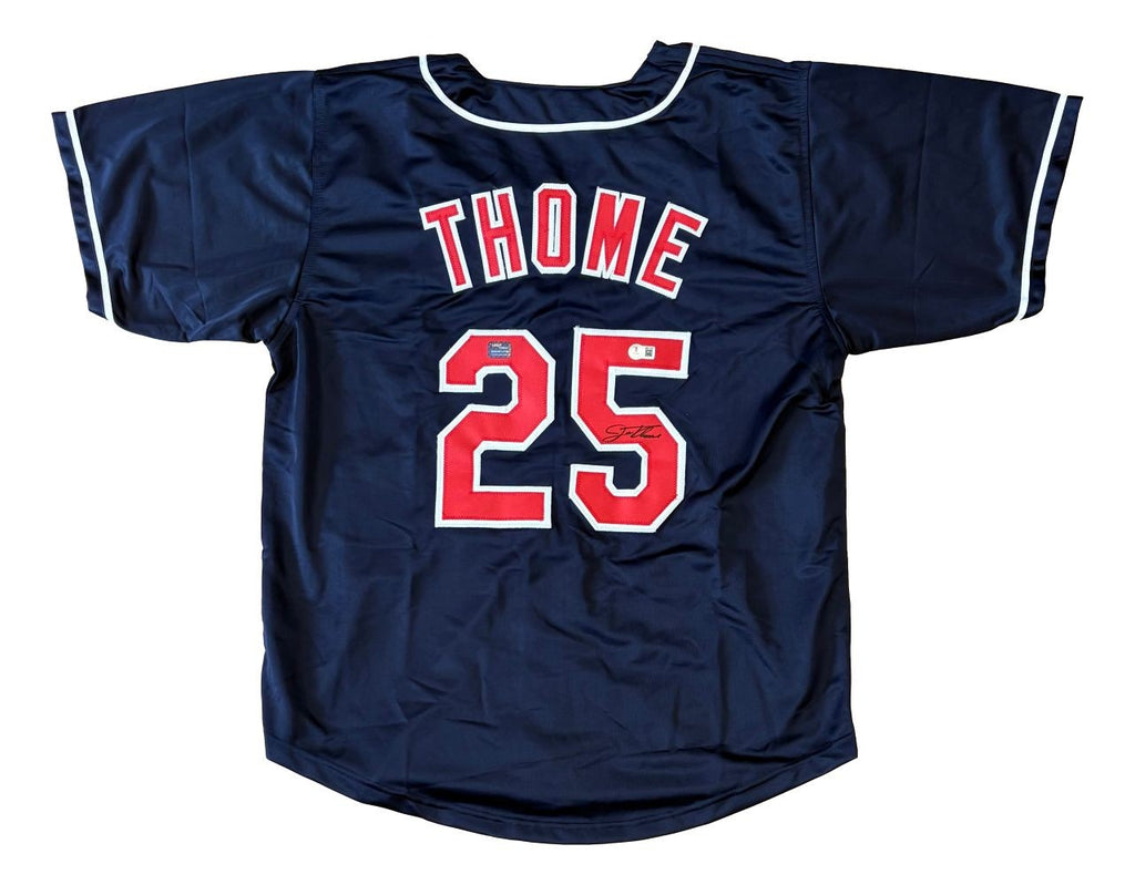 Featured is a Jim Thome signed custom baseball jersey. This jersey has been hand signed by Thome and comes with the Beckett hologram and certificate of authenticity. This jersey has professionally sewn letters and numbers and is size XL. This jersey has no team tags or emblems and is intended as a sports collectible. This jersey would make a great addition to any sports collection!. SPECIFICATIONS Autographed By: Jim Thome Team: Cleveland Guardians Sport: Baseball Authentication: Beckett Grading Services